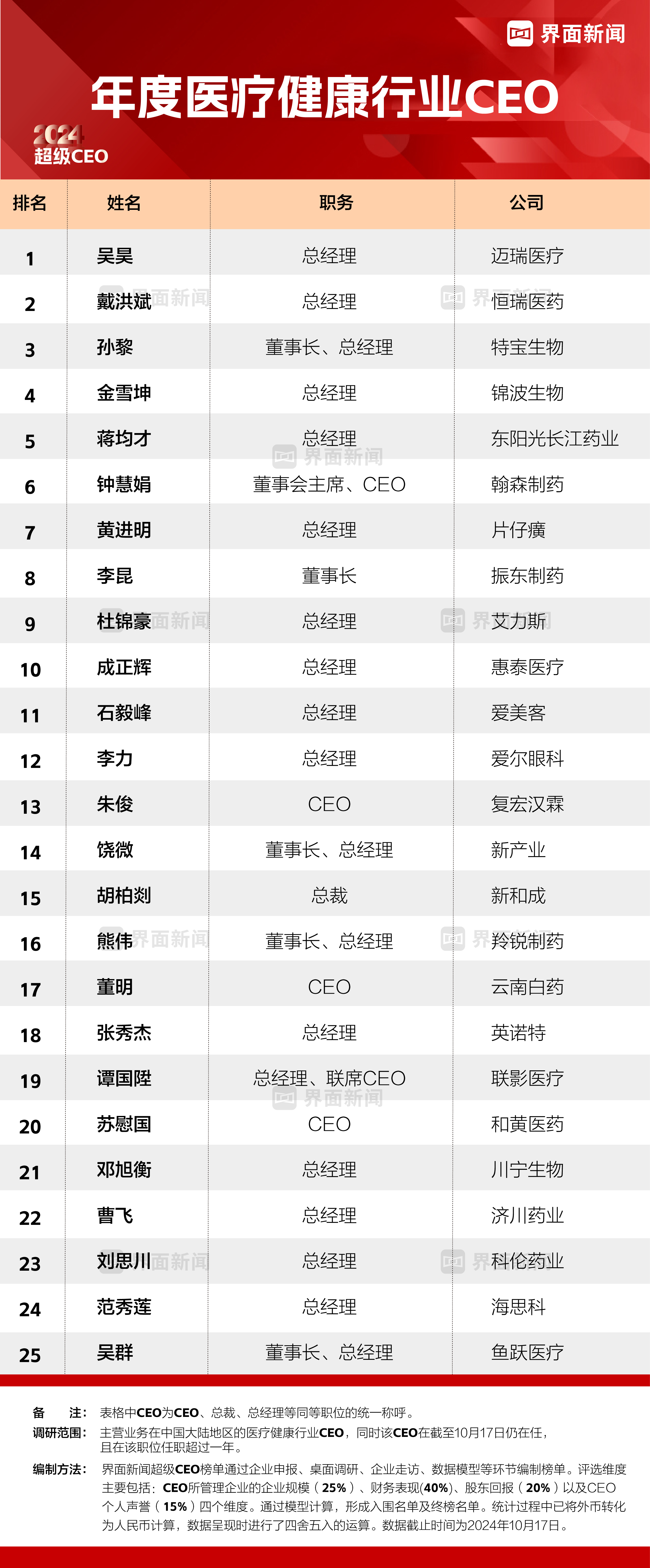 本篇中CEO为首席执行官、总裁、总经理等同等职位的统一称呼。我们的研究面向中国地区医疗健康企业CEO。界面新闻超级CEO榜单通过企业申报、桌面调研、企业走访、数据模型等环节编制榜单。评选维度主要包括:企业规模(25%)、财务表现(40%)、股东回报(20%)、个人声誉(15%)四个维度。通过模型估算,形成入围名单及终榜名单。统计过程中已将外币转化为人民币计算,数据呈现时进行了四舍五入的运算。