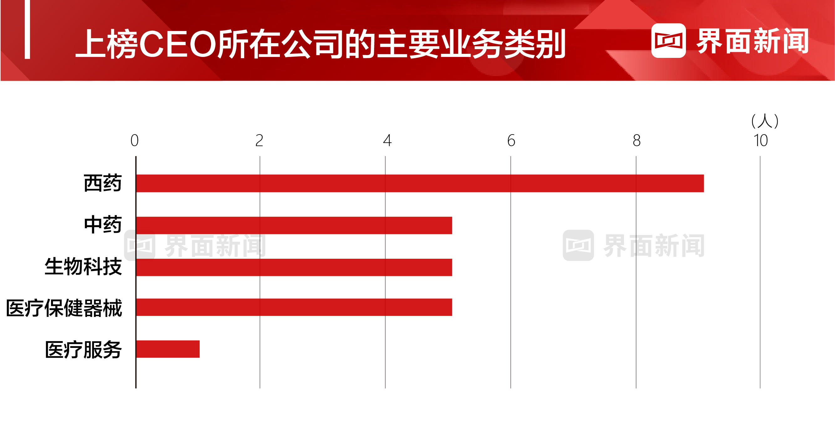 从上榜CEO所在公司的主营业务来看,以西药业务为主的公司最多,共有9家;主营中药、生物科技、医疗保健器械业务的公司各有5家,主营医疗服务业务的公司有1家。