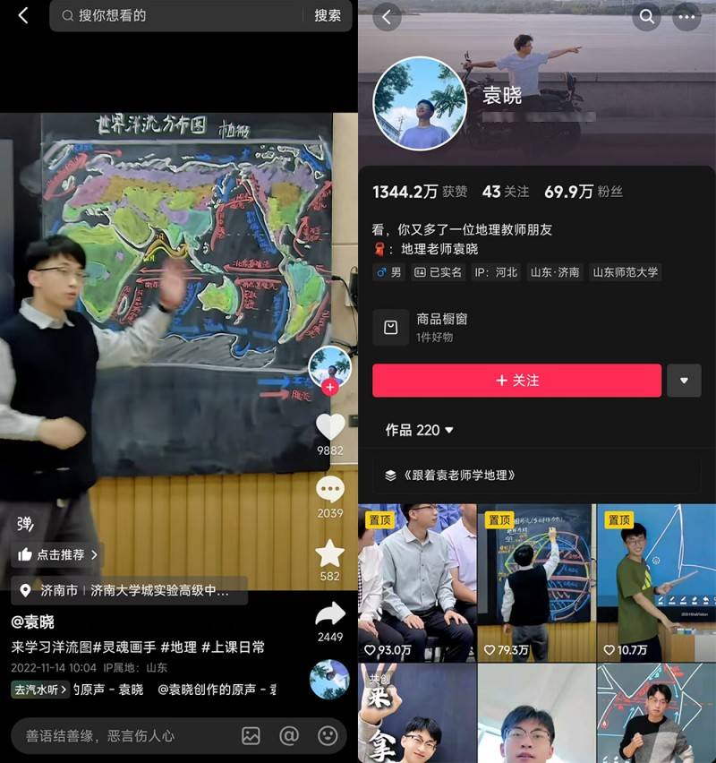 据悉,抖音上还有许多袁晓这样的中小学教师、师范学生,他们共同交流教学经验,为成为一名“好老师”努力。地理系师范生@Liu同学 用一张卫生纸走街串巷,讲解“白贝罗风压定律”;辽宁抚顺中学物理老师@光头强老师 自制空气炮,可打翻教师另一头的易拉罐;河南省信阳市固始县张广庙镇第一小学科学老师@科学小小小实验 用矿泉水瓶制作水火箭……这些都已成为教师们广为分享的“云课件”。