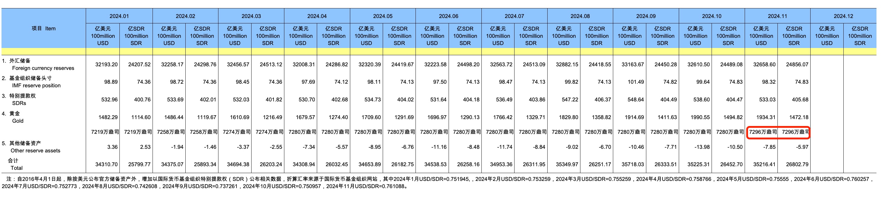 12月7日,中国人民银行发布最新官方储备资产数据,截至11月末,我国黄金储备报7296万盎司,较10月末的7280万盎司增加16万盎司。此前,央行连续6个月暂停增持黄金。