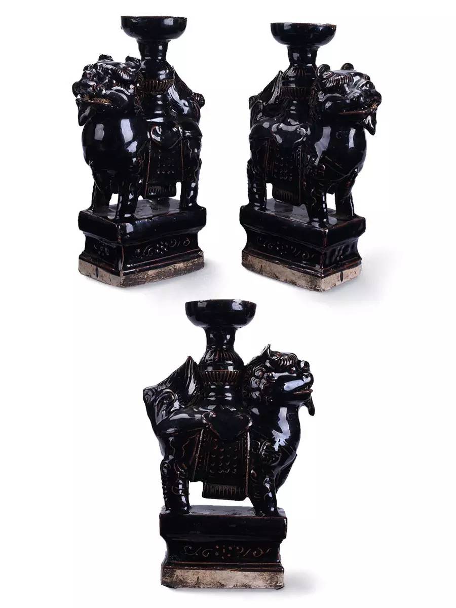 整体造型为一走狮,昂首、胸微收,神态温和可掬,通体施黑釉,釉质滋润如漆,属典型明代风格。狮子背部上方托以烛座,既美观又实用。