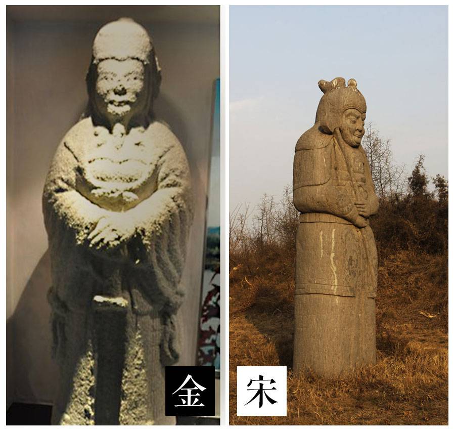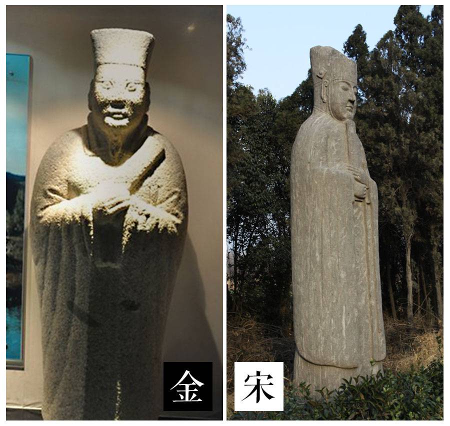 再看一组文官像,左侧是金太祖陵园所用,而右侧为北宋时期,两者有明显不同,金代文官像风格粗犷,浑厚大气,北宋的则更为精致和内敛。