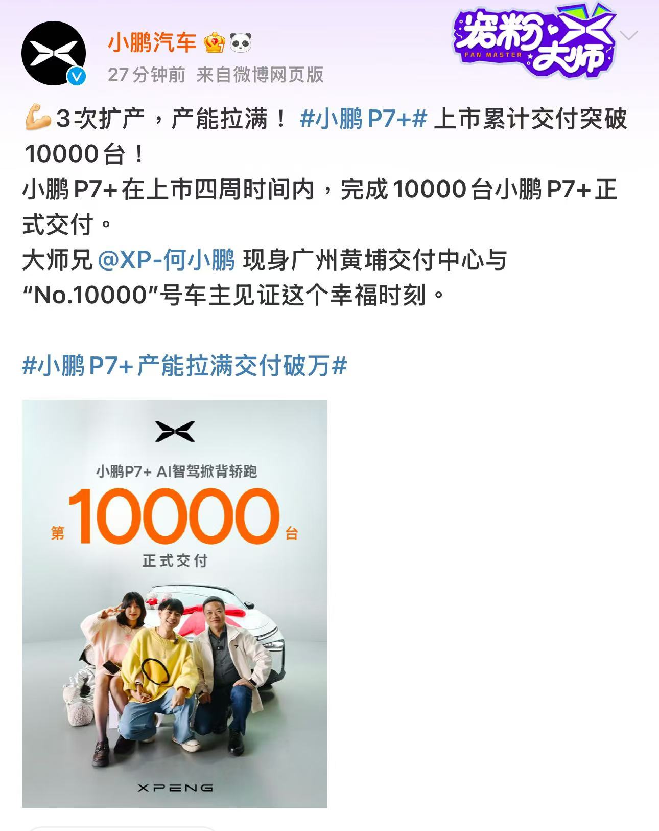 小鹏汽车微博12月11日消息,小鹏P7+在上市四周时间内,完成10000台小鹏P7+正式交付。