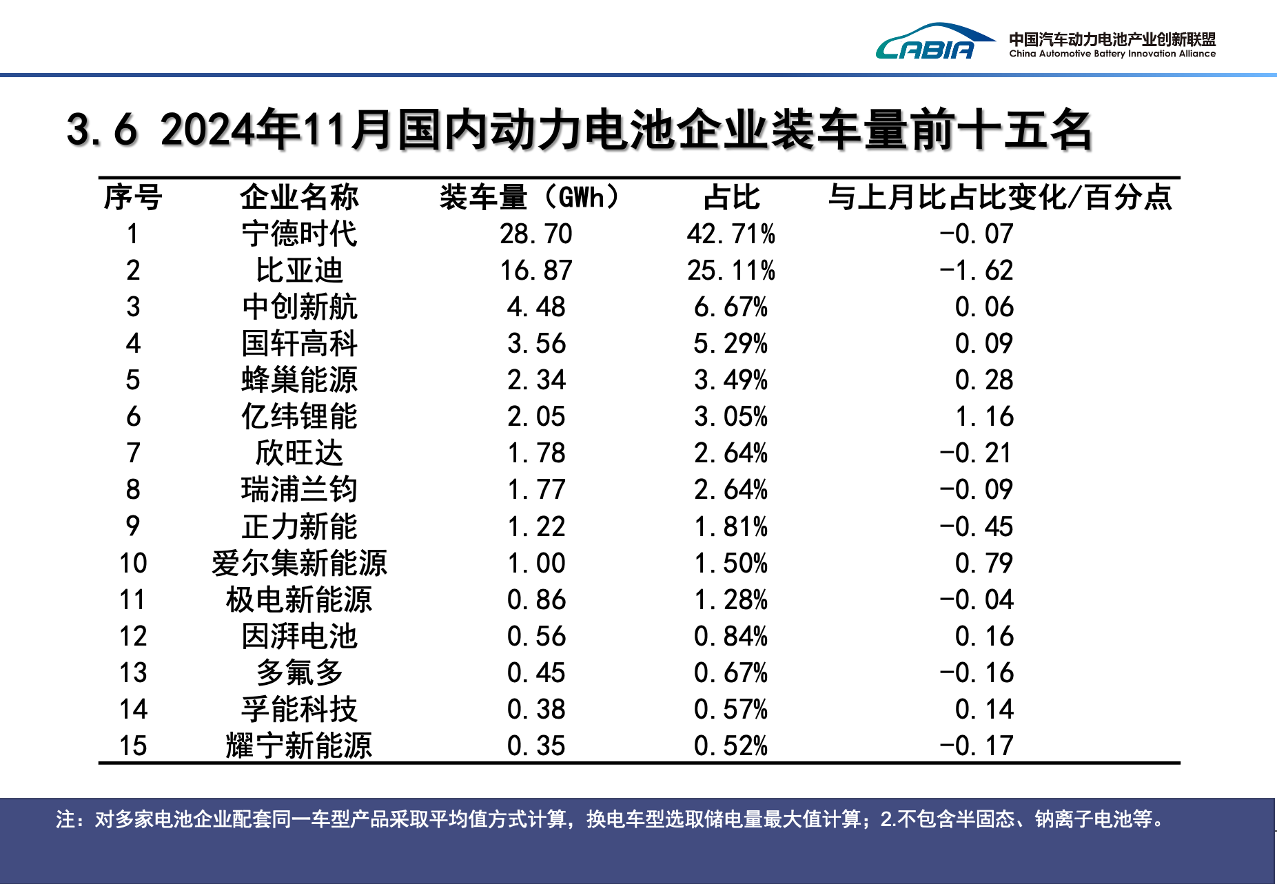 其中,宁德时代(300750.SZ)上月仍稳坐国内动力电池装车榜首,其11月在国内实现了28.7 GWh的装车量,市占率达42.71%,较上月下滑了0.07个百分点。