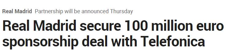 根据协议,西班牙电信公司Telefónica将会在未来两个赛季成为皇马足球队以及篮球队赞助商,球队将参与Telefónica的一系列广告活动。此外,该公司还将会为伯纳乌提供WIFI服务以及推出新的官方应用程序。