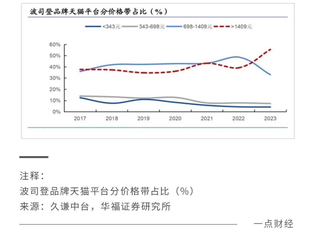 根据华福证券的数据统计,从后面几年波司登在天猫的价格走势来看,1500元以上的的产品占比明显呈上升态势,而698~1409元、343~698元、343元以下的产品占比都在下滑。