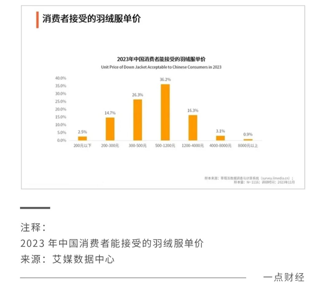事实上,对于大众而言能接受的是依然是千元以下的几百元羽绒服。艾媒咨询的分析报告指出,有将近八成消费者愿意接受1200元以下的羽绒服,而选择1200元以上价格区间的消费者占比只有20.3%。