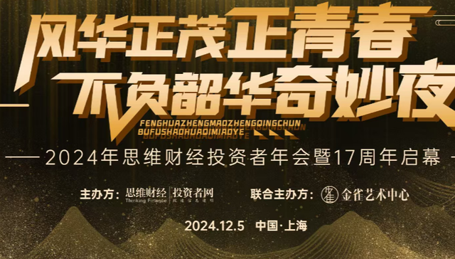 12月5日,由思维财经&投资者网主办、金雀艺术中心联合协办的“2024年投资者年会暨17周年启幕仪式”在上海黄浦江畔隆重举行,围绕主题“风华正茂正青春,不负韶华奇妙夜”,大会回顾了思维财经&投资者网的发展历程,并与各界伙伴共同展望未来,共谋发展良策。