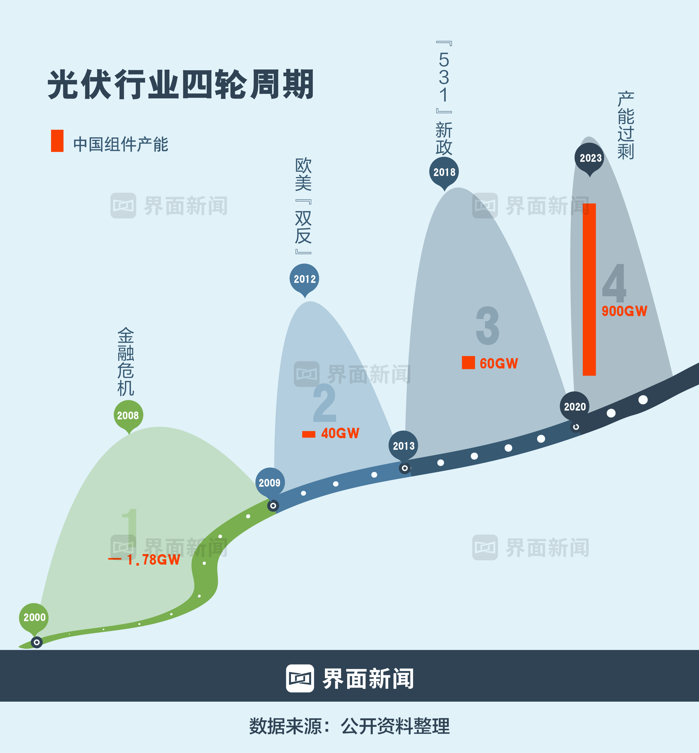 光伏是强周期性行业。自2000年左右至今,中国光伏已经历了四轮洗牌周期。从2008年的金融危机、2012年的欧美“双反”,到2015年的“531新政”,再到如今第四轮的产能过剩。