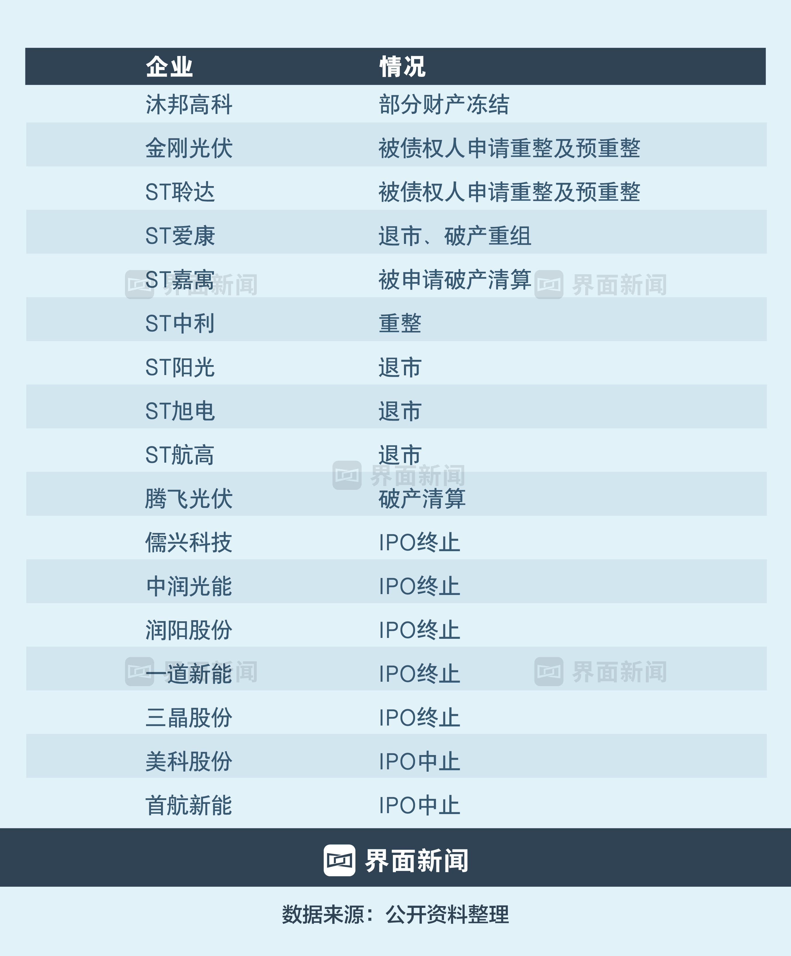 据界面新闻根据公开信息不完全统计,近一年半以来,光伏终止、延期、停产的项目不少于50个,近30家公司在资本市场的募资终止。还有十余家企业退市、破产重整、清算,其中包括老牌企业ST爱康(002610.SZ)、ST阳光(600220.SH)、*ST中利(002309.SZ)等。