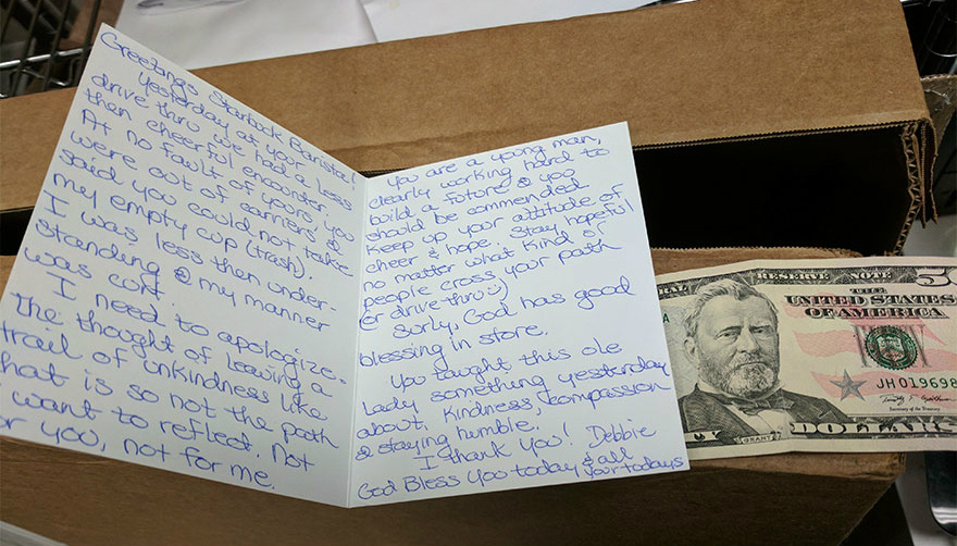 这位自称Debbie的女乘客在周一(20日)开车来到了这家星巴克点单。可能她只是想要一杯早晨提神的咖啡,但就因为店内的外带杯托用完了,她给了咖啡师不少脸色。回想了她的行为之后,Debbie决定弥补那次“不开心的经历”,第二天又来到咖啡厅,还给咖啡师一个温馨的道歉卡。
