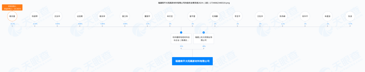 天眼查显示,太阳高新成立于2017年2月,公司法定代表人、董事长是楼永富,目前由楼永富通过持股31.5%的杭州睿新实际控制51%股份。