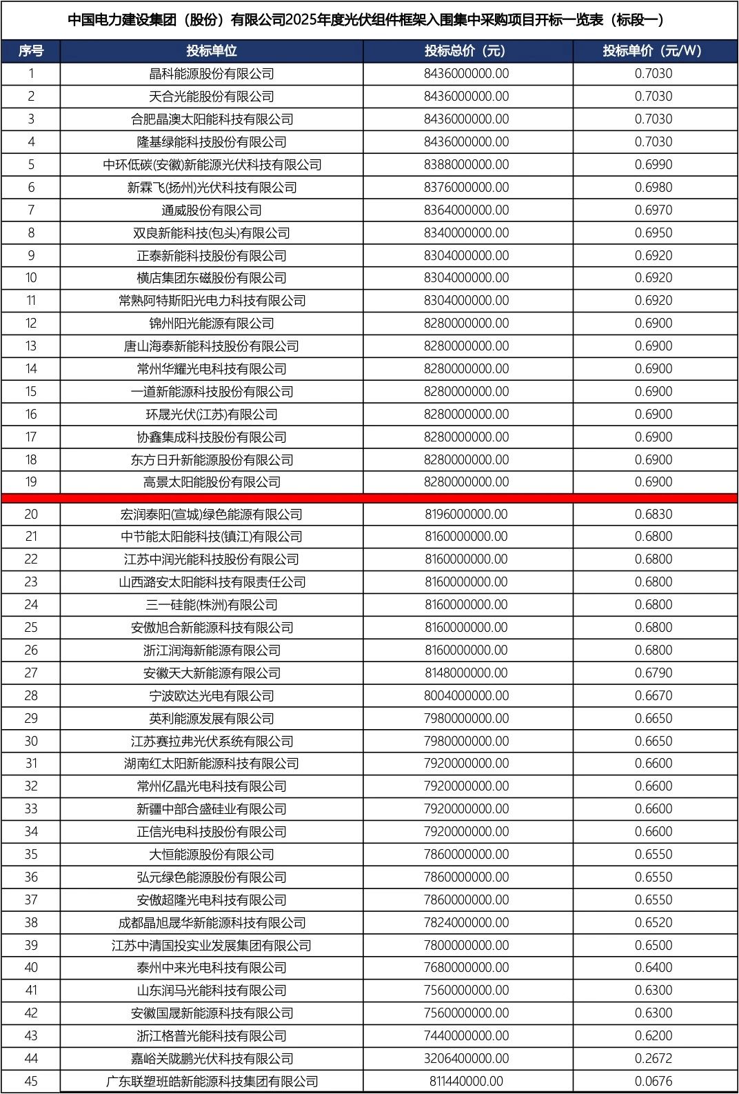 在协会公开的中国电建的组件框架采购(标段一)开标价格中,企业报价高于0.69元/瓦的共有19家,组件四大龙头晶科能源(688223.SH)、天合光能(688599.SH)、晶澳科技(002459.SZ)、隆基绿能(601012.SH)报价相同,均给出0.703元/W的投标单价。