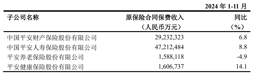 中国平安:前11月4个子公司累计原保险合同保费收入约7963.97亿元