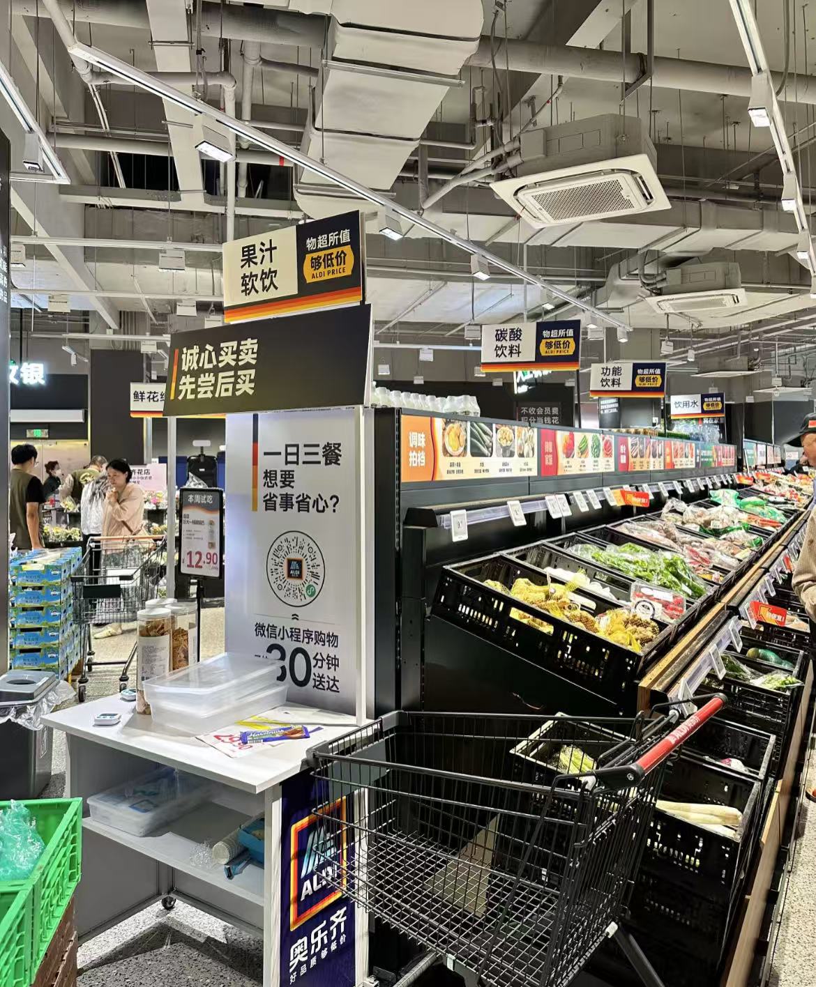 尽管早在5年前就进入了中国,但这间连锁超市在中国社交平台上声量真正大起来是从近两年起。令更多消费者关注到它的,是这两年间零售业兴起的价格战,性价比消费趋势下,不少国内商超开始对价格“砍一刀”以吸引客流。奥乐齐则在这场战役中,于去年末开始高举“9块9”的旗帜,大力铺陈营销之余,不断上新低价商品。进入2024年以来,奥乐齐降价产品累计已近300款,总体商品数量中低于9块9的已有超500款。