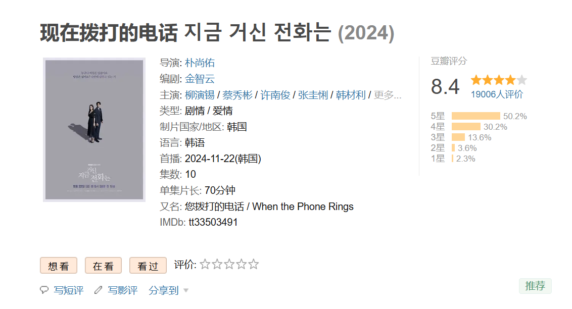 各大娱乐公司纷纷入局网文改编,这无疑能够增加韩国剧集来源的多样性,也为韩国网文市场的发展注入了强大动力。时至今日,在韩剧兴起的这股网文改编潮流中,从当下的成绩看,《现在拨打的电话》可以说是韩国又一次颇有成效的改编案例了。