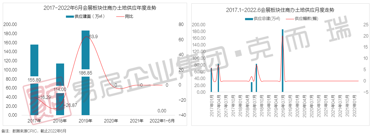 据克而瑞发布的数据显示,会展片区住商办土地供销集中在2020年以前,2019年创供应峰值,受疫情叠加市场下行影响,2020年起板块连续三年无土地供应及成交。