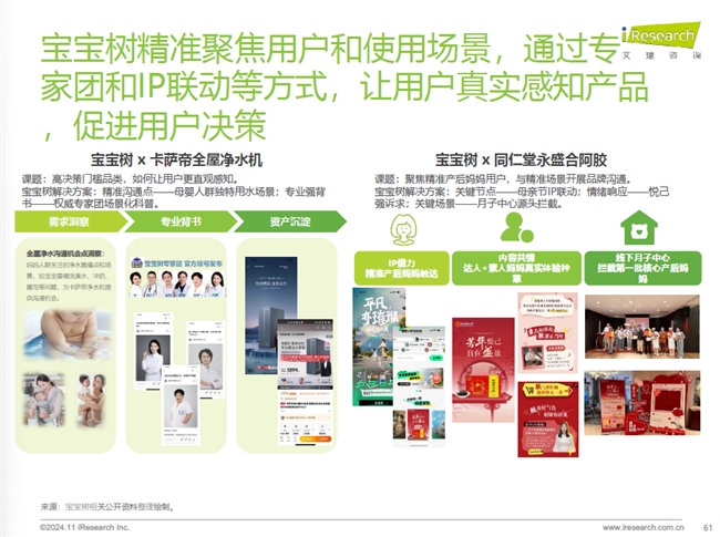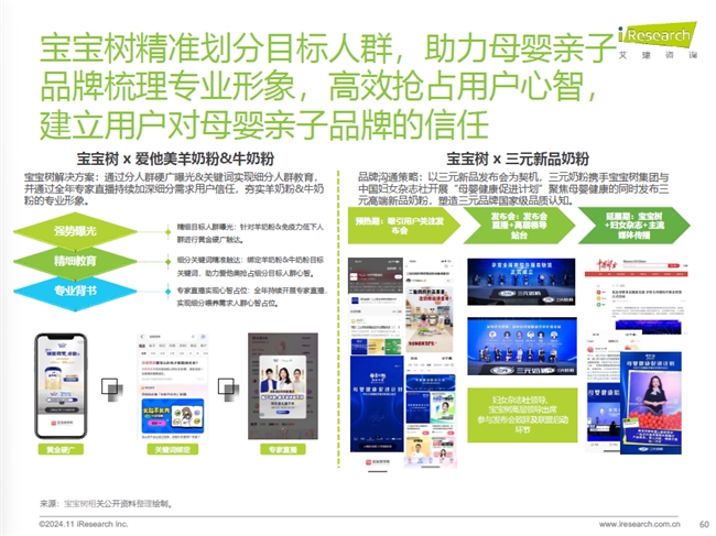 在营销方面,宝宝树也具有显著特色。通过精准划分目标人群,宝宝树助力母婴亲子品牌梳理专业形象,高效抢占用户心智,建立用户对母婴亲子品牌的信任。例如,宝宝树在与品牌奶粉合作的过程中,通过分人群硬广曝光和关键词实现细分人群教育,同时结合全年专家直播科普持续加深用户认知,不仅提升了品牌的专业度,还增强了用户对品牌的忠诚度。