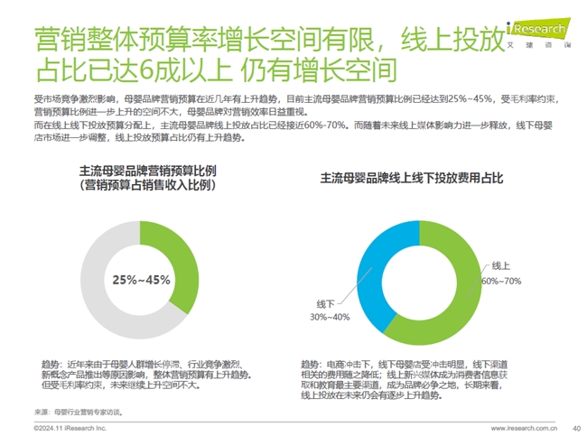 由于母婴人群消费周期短且集中、品牌忠诚度相对高,扩大品牌在新晋父母中的知名度尤为重要。在竞争激烈的市场环境下,母婴品牌营销的整体目标着眼于整体销售目标的达成,并将该目标拆解成新用户触达、品牌形象和专业性提升以及促进复购等细分指标。值得注意的是,线上新兴媒体已成为消费者信息获取和教育最主要渠道,成为品牌必争之地。主流母婴品牌营销预算在近几年有上升趋势,目前主流母婴品牌营销预算比例已经达到25%~45%。然而,受毛利率约束,营销预算比例进一步上升的空间不大,母婴品牌对营销效率日益重视。