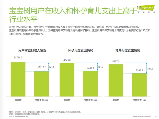 调研数据显示,宝宝树的用户在家庭月收入23764元,高于行业990元,怀孕、育儿月度支出分别为4643元和5737元,分别高于行业150元和340元左右,进一步证明了宝宝树在高端母婴市场中的领先地位。