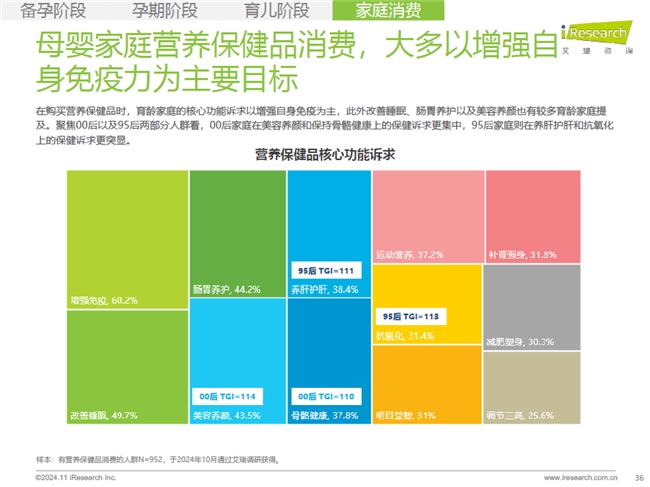在备孕阶段,家庭月均消费金额为1219.2元。对于严肃备孕人群来说,由于对备孕过程有更高要求,其消费支出明显高于随缘备孕人群。进入孕期,科学坐月子的理念越发受到年轻用户的认可,70.5%的家庭计划采用第三方月子服务,并遵循科学指导进行产后恢复,特别是在95后准父母中这一趋势更为明显。孕期准父母的月子服务预算约为4.2万元,其中产妇照料服务是选择月子中心时的主要考量因素。母婴家庭在营养保健品上的月均消费为513元,他们在选择产品时最关注成分的安全性。增强免疫力是母婴家庭购买营养保健品的主要目的。