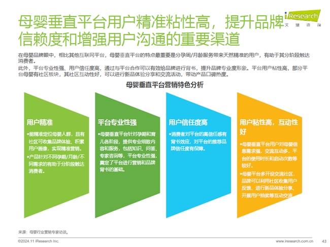 在营销策略上,母婴品牌已经摸索出一套基于孕周/月龄的消费者教育、促销策略组合,进行精准营销。例如,在孕早期采用科普宣教的方式,普及奶粉的成分与营养知识;在孕晚期则采用共情式营销,强调对孕妇和宝宝的关爱与理解,提供情绪价值。其中,母婴垂直平台凭借其精准的用户定位、专业的内容和服务以及高用户粘性,成为母婴品牌营销的重要渠道。