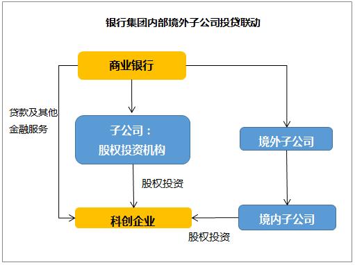 商业银行在境外设立股权投资机构后,向其推荐优质客户开展股权投资,根据客户不同发展阶段提供相应贷款和其他服务产品支持,提升本行综合化金融服务水平。在这种模式下,由于子公司属于银行集团内部机构,决策链条缩短,沟通成本降低,集团化综合经营优势明显。