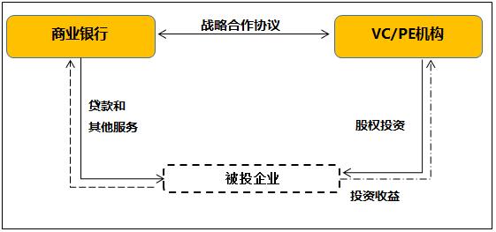 “银行+VC/PE”模式是目前国内商业银行探索投贷联动的主流模式,也是为了几年商业银行会选择的主要投贷联动方式之一。对于股权投资机构已投资进入或即将投资的企业,给予一定比例的贷款及相关金融产品的支持,并同时锁定被投资企业包括顾问咨询服务及资金结算等业务,实现股权与债权的结合。