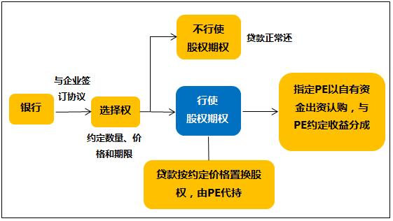 银行为了分享股权投资背景下债权介入带来的超额回报,与合作的风险投资机构建立一种选择权(期权),即在贷款协议签订时,约定可以把贷款作价转换为对应比例的股权期权,当融资企业通过IPO、股权转让、或者被并购等方式实现股权溢价后,可由风险投资机构抛售所持的这部分股权,将收益 分给银行,从而实现收益共享和分成。通过这样的方式,银行一方面规避了监管的限制但又同时分享了企业的股权回报,另一方面通过与创投机构一定程度上起到了 风险缓释的作用,相比于银行,创投机构在对于创业阶段企业的筛选上具有更强的专业能力,从而保证获得融资企业的质量。