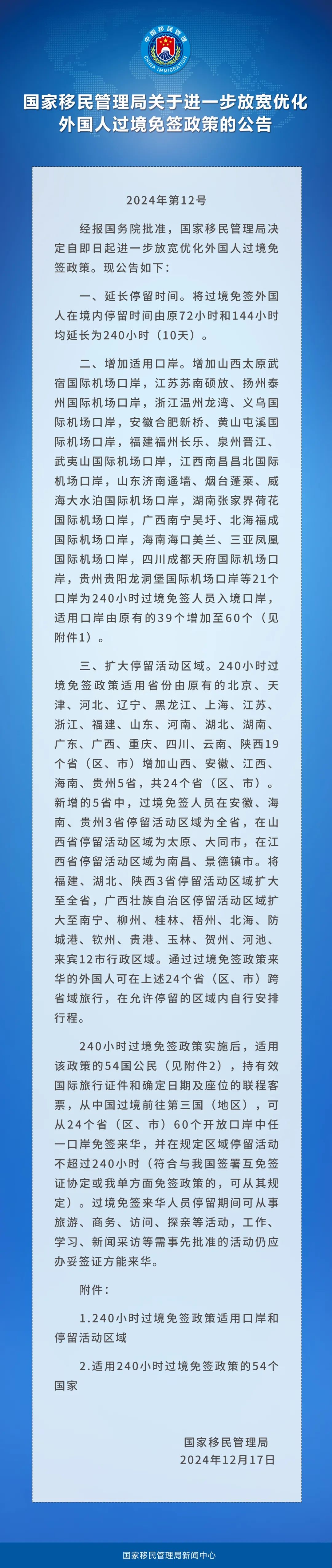 国家移民管理局今天发布公告,即日起全面放宽优化过境免签政策,将过境免签外国人在境内停留时间由原72小时和144小时均延长为240小时(10天),同时新增21个口岸为过境免签人员入出境口岸,并进一步扩大停留活动区域。符合条件的俄罗斯、巴西、英国、美国、加拿大等54国人员,从中国过境前往第三国(地区),可从24个省(区、市)60个对外开放口岸中任一口岸免签来华,并在规定区域停留活动不超过240小时。