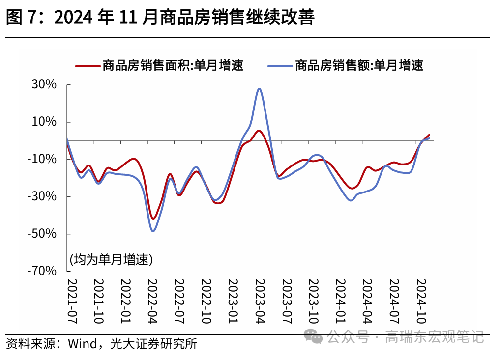 从11月经济数据来看,“两新”、“两重”和稳楼市的政策效用明显。一是,“两新”涉及的家具、家电和汽车销售同比增速出现显著改善,设备更新成为固投增速的主要贡献力量;二是,在低基数支撑下,全国商品房销售单月同比增速由负转正,地产开发投资低位波动但跌幅收窄;三是,“两重”所支持的水利及燃气投资的增速较强。