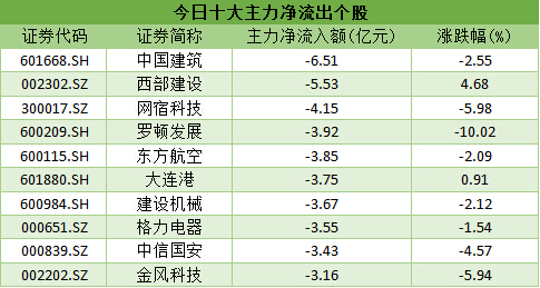 中国建筑(601668.SH)、西部建设(002302.SZ)和网宿科技(300017.SZ)为两市主力净流出额最高的三只个股,其净流出额分别为6.51亿元、5.53亿元和4.15亿元。