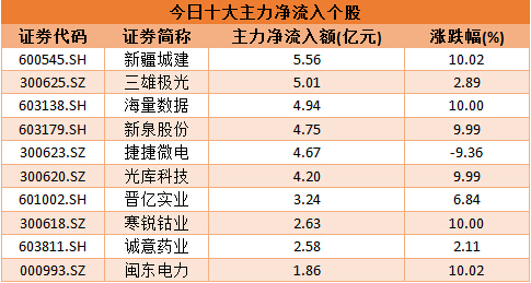 两市个股中,新疆城建(600545.SH)、三雄极光(300625.SZ)和海量数据(603138.SH)的净流入额排在前三,分别为5.56亿元、5.01亿元和4.94亿元,其中新疆城建和海量数据涨停收盘。新疆城建所在的新疆军工板块搭乘“一带一路”之机遇持续走强,而三雄极光和海量数据均为新股,上市以来分别连续拉出9个、18个一字涨停板。
