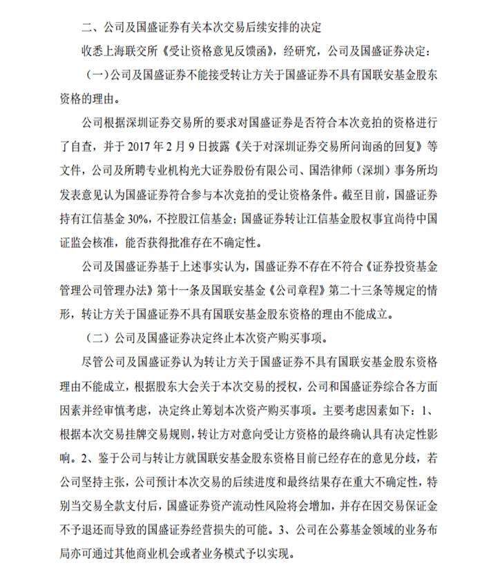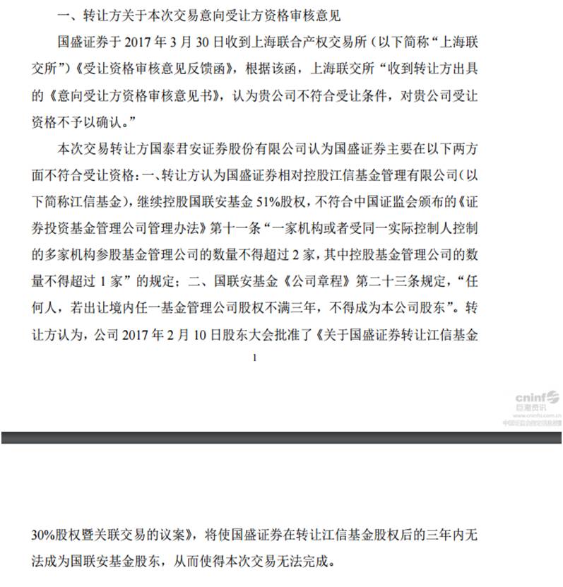 仔细来看,是由于交易转让方国泰君安认为国盛证券主要在以下两方面不符合受让资格:一、国盛证券相对控股江信基金管理有限公司,继续控股国联安基金 51%股权,不符合中国证监会颁布的《证券投资基金管理公司管理办法》第十一条“一家机构或者受同一实际控制人控制的多家机构参股基金管理公司的数量不得超过 2 家,其中控股基金管理公司的数量不得超过 1 家”的规定;二、国联安基金《公司章程》第二十三条规定,“任何人,若出让境内任一基金管理公司股权不满三年,不得成为本公司股东”。转让方认为,公司 2017 年 2 月 10 日股东大会批准了《关于国盛证券转让江信基金30%股权暨关联交易的议案》,将使国盛证券在转让江信基金股权后的三年内无法成为国联安基金股东,从而使得本次交易无法完成。