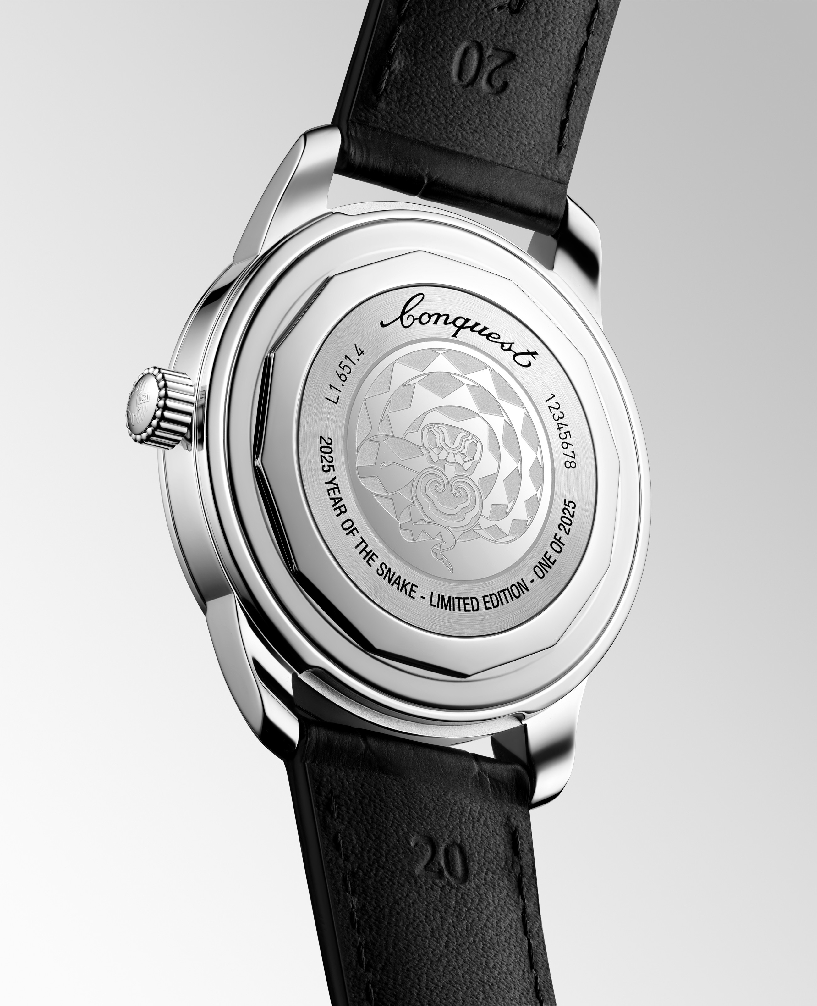 为庆祝即将到来的乙巳蛇年,浪琴(Longines)特邀艺术家、中央美术学院教授邬建安,以现代视觉艺术形式重新诠释中国传统元素,创作“灵蛇献宝”图腾,并将其镌刻于表背,寓意新年万事长顺、福运连连,推出浪琴全新康卡斯复刻系列蛇年生肖限量款腕表。这枚腕表在浪琴表全新和平饭店直营店揭幕仪式上首次亮相。