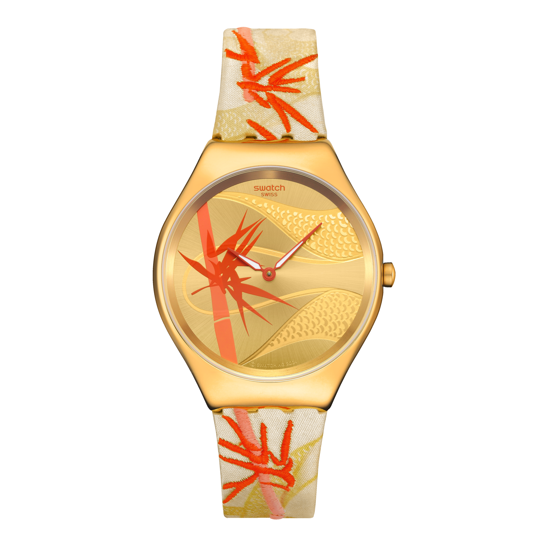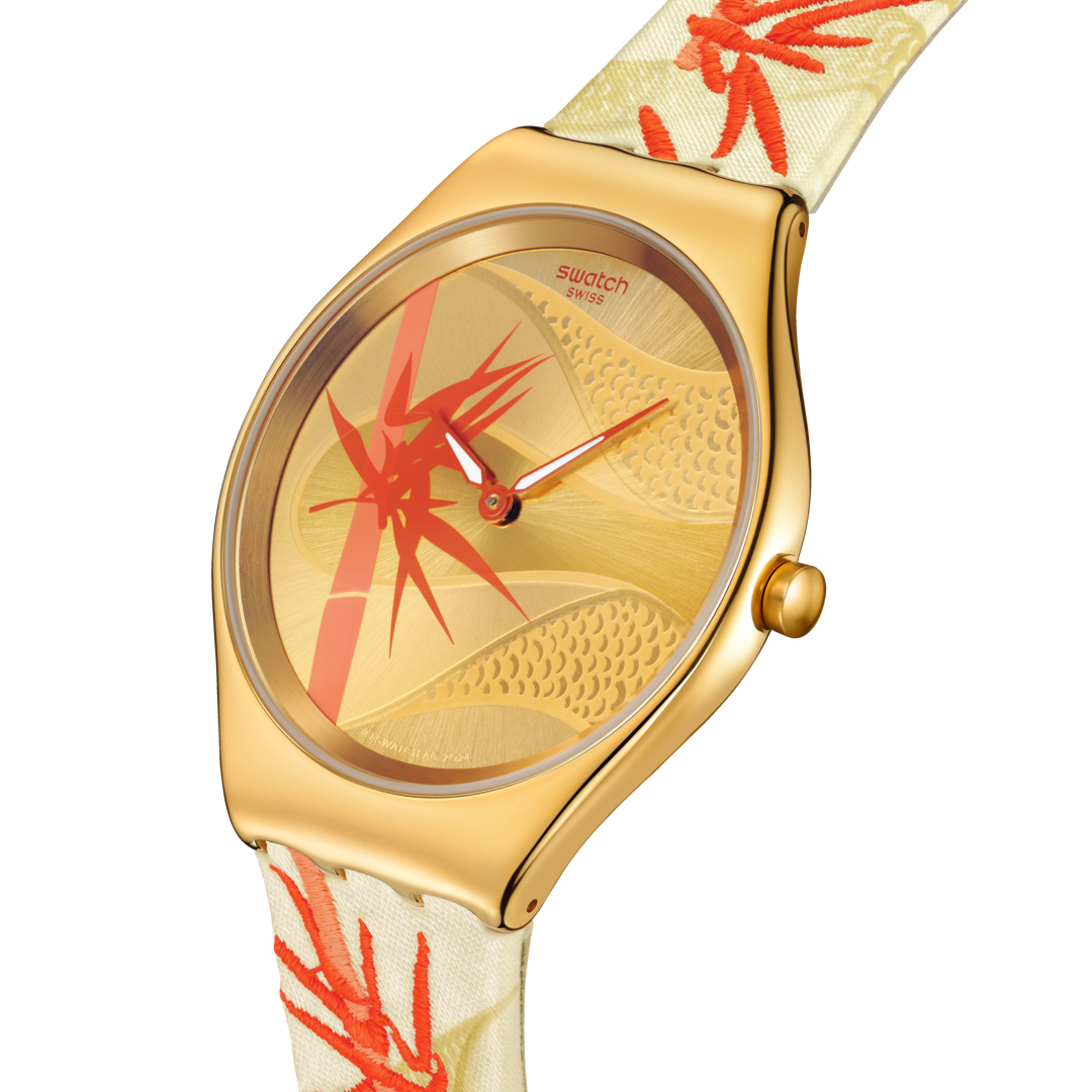 赤竹鎏金SKIN IRONY流线型腕表以其纤薄的表壳与柔软织物表带巧妙平衡优雅与舒适。金蛇蜿蜒于柔韧赤竹,蕴满坚韧向上能量。刺绣赤竹搭配轻盈金属表盘,寓意竹节高升携来鸿运。