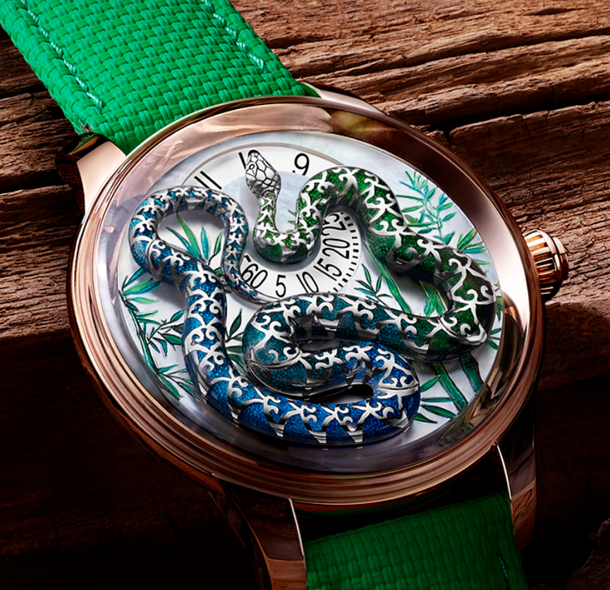 财富、健康、守护,千百年来蛇所承载的祝福延绵永续。雅克德罗献礼中国农历蛇年,从东方灵蛇意象汲取灵感,再度邀请品牌挚友、《指环王》小说插画大师约翰·豪(John Howe)合作推出两枚独家蛇年特别版腕表,分别为特定制珍珠母贝青竹版及双色Sonora Sunrise赤铜矿版。