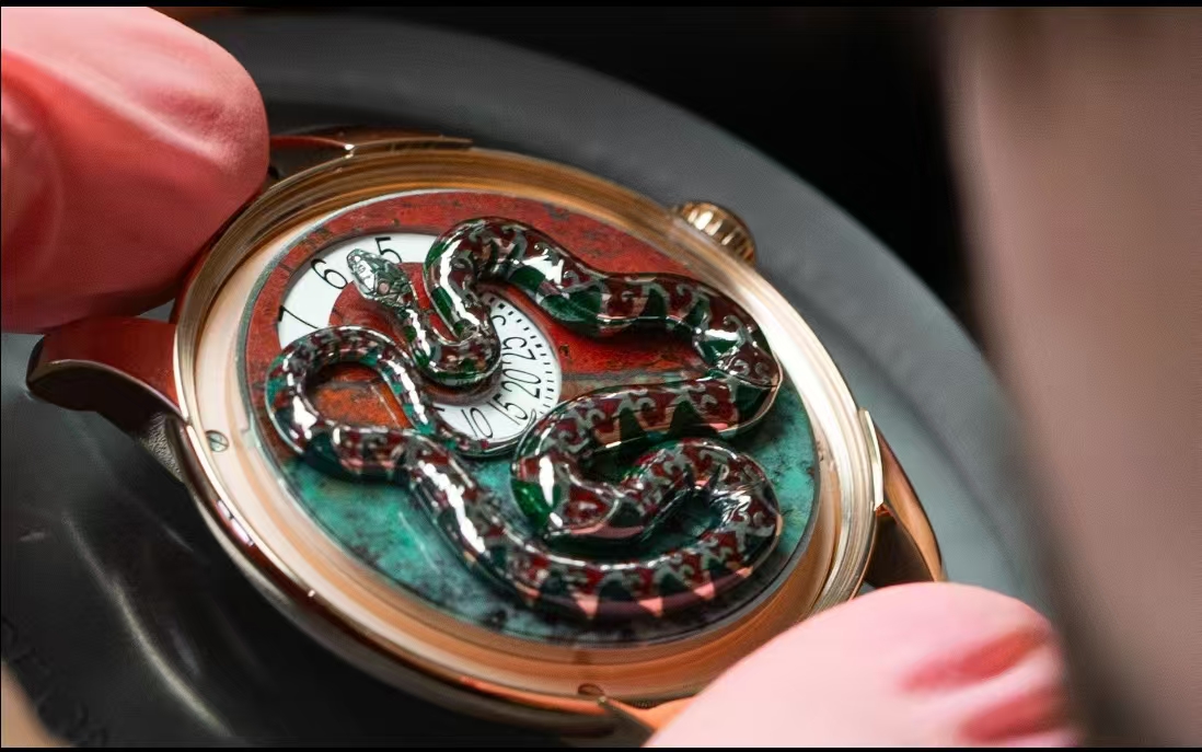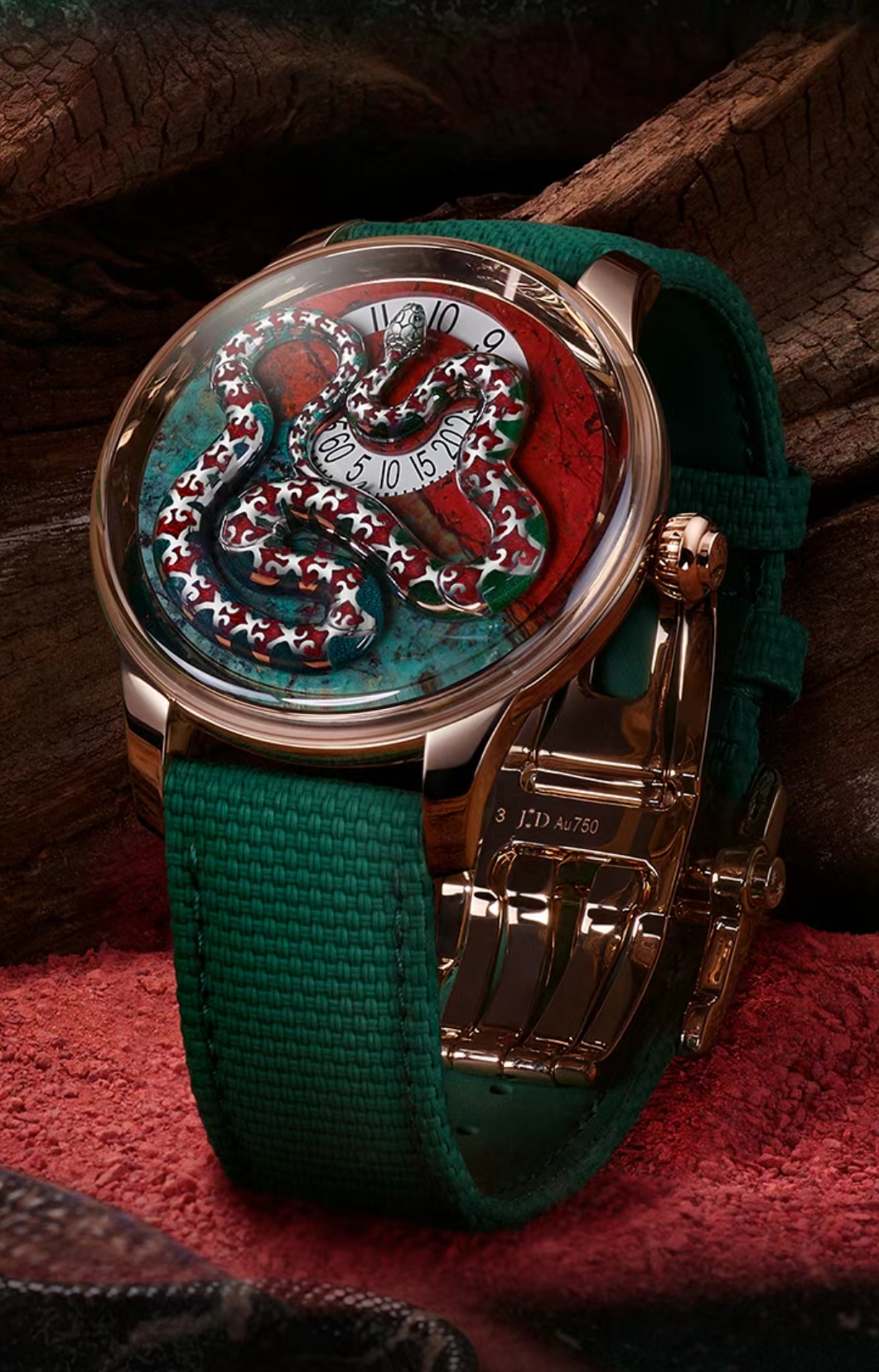 雅克德罗蛇年作品延续、再创蛇古已有之的庇护形象。品牌首度采用无指针设计,蛇头向上指示小时,蛇尾蜿蜒指示分钟,以转盘转动显示时间。这一突破性设计让灵蛇犹如掌控守护时间的王者,横亘方寸,跨越时空,掌时护主。