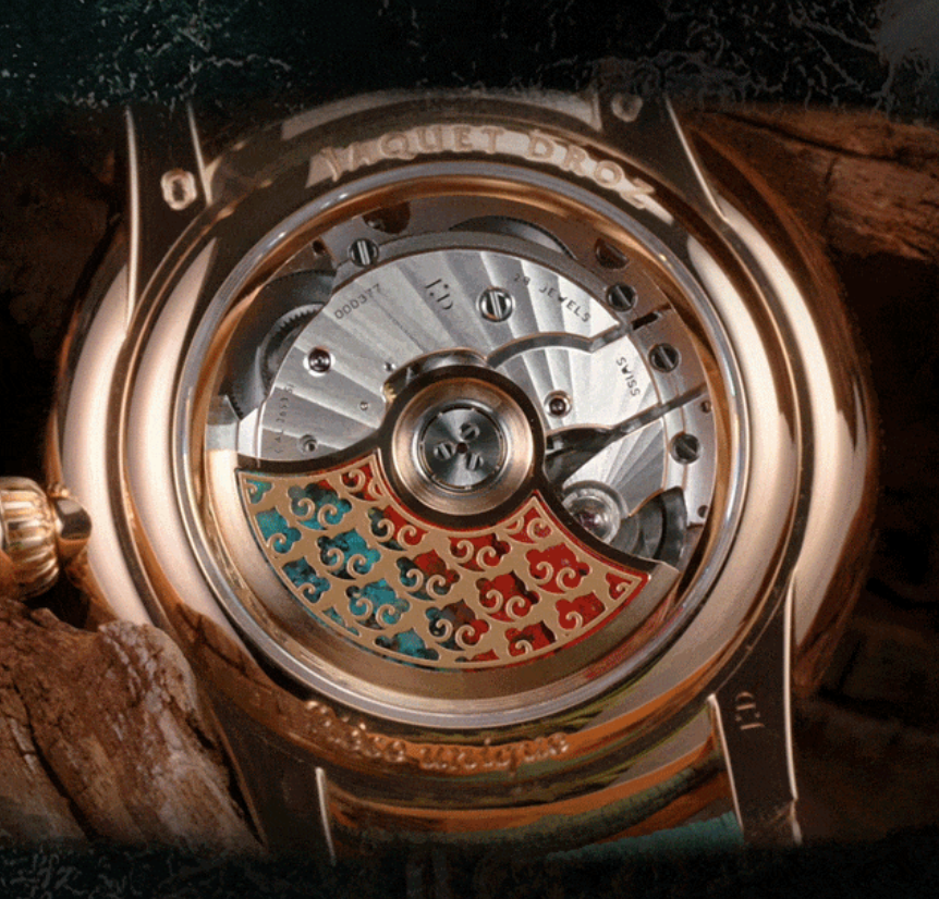 蛇之健康顺遂的美好寓意是此次蛇年特别版腕表的灵感来源之一。约翰·豪设计了蛇身上金雕与珐琅工艺共同铸就的祥云般“如意”图案,寓意“好运加身”的美好祝福。值得一提的是,由于蛇身圆滑逼真呈流畅曲线,珐琅粉几乎无法固定在其圆形表面,雅克德罗则让珐琅紧随蛇身起伏蜿蜒,呈现出鬼斧神工般的渐变色彩。盘面上由白金雕琢而成的青色与赤色“小龙”栩栩如生,呼之欲出的蛇身几乎盘踞整个盘面,气势如虹,形如中国书法艺术,神似势如破竹。