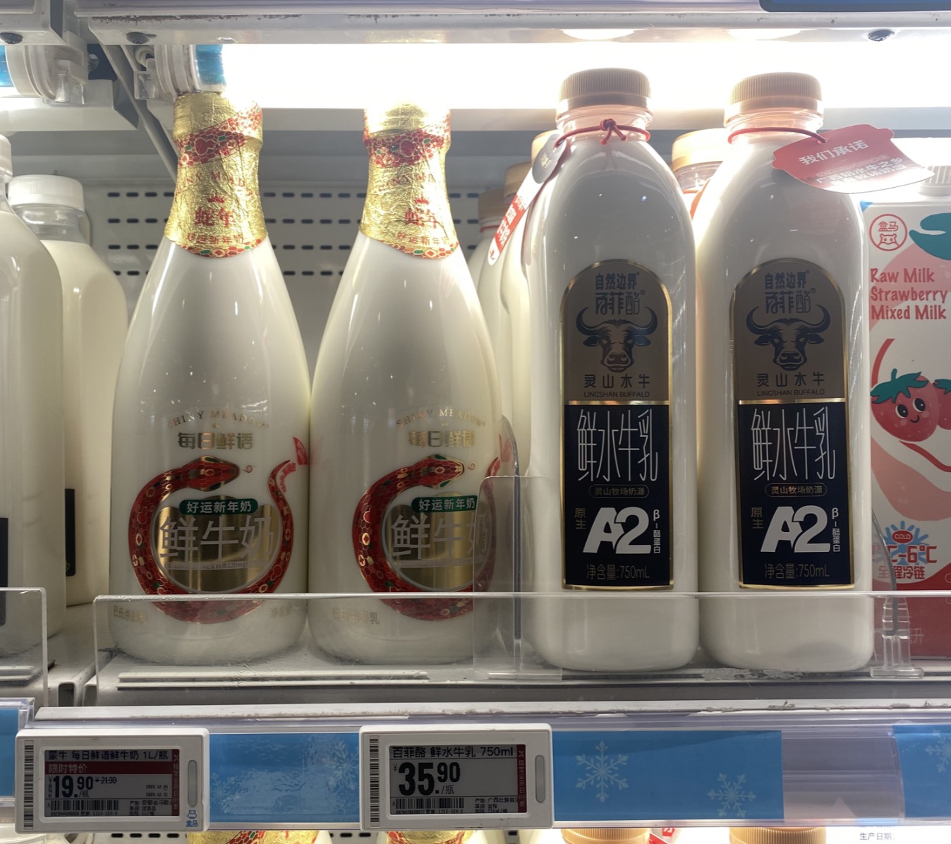 从市场售价表现看,水牛奶的价格几乎高于所有的牛奶产品。12月17日,界面新闻在北京一家盒马鲜生货架看到,4瓶180毫升的一提百菲酪低温水牛奶售价是29.9元,比盒马有机高钙鲜牛奶(240毫升*4)的售价贵了20%,而百菲酪A2牛奶750毫升的产品售价更是35.9元,比同为A2的三元鲜奶19.9元的价格贵了80%。
