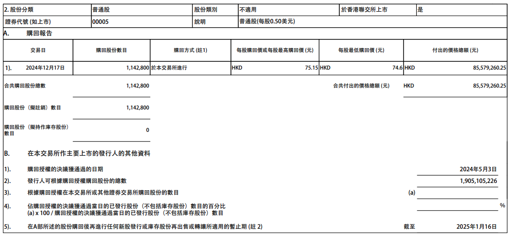 汇丰控股12月18日在港交所公告,于2024年12月17日在港交所斥资约8557.93万港元回购114.28万股公司股份;同日在英国伦交所等斥资约2107.48万英镑回购股份276.8697万股公司股份。