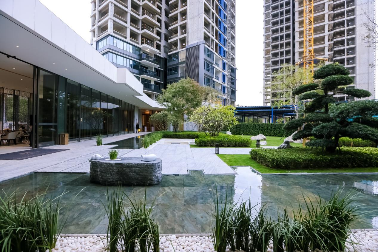 - 石影水礼,劲松迎宾。开门见水,遇水生财,演绎塔尖基业长青与门第风雅。