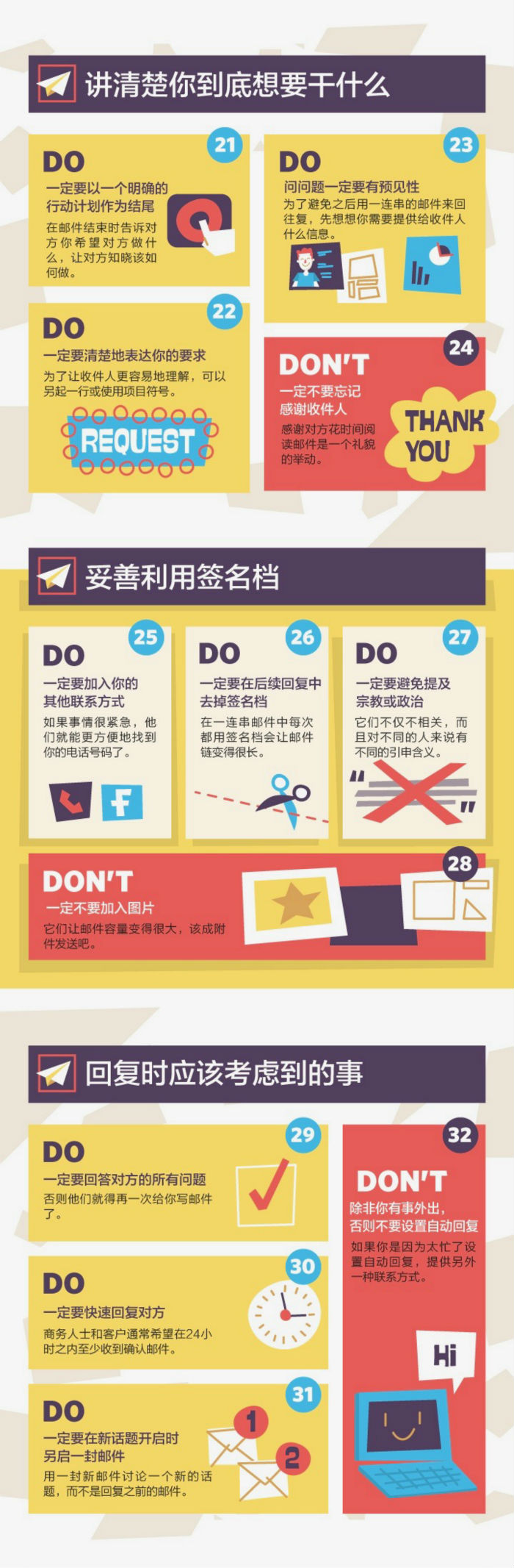 其实只要遵守一些规则,写好一封电邮很简单:主题栏不要空着,明确中心思想和写信来意,注意空行和拼写规范,附件不要太大……核心要义其实只有一个——方便收件人快速掌握信息,了解应该采取什么行动。
