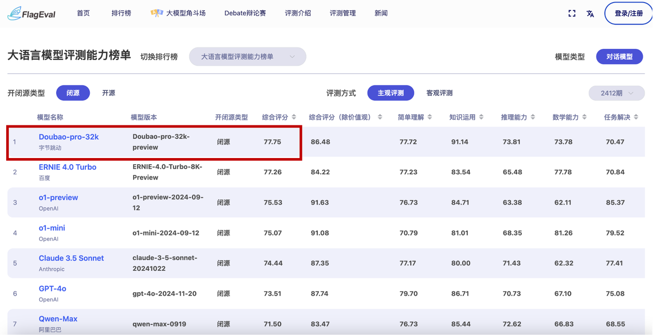 12月19日,智源研究院发布国内外100余个,开源和商业闭源的大模型综合及专项评测结果。“大语言模型评测能力榜单”中,豆包通用模型pro(Doubao-pro-32k-preview),在主观评测中排名第一。