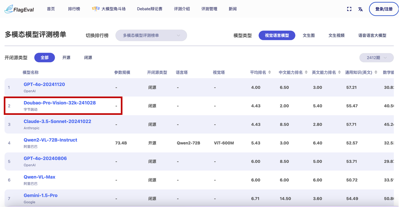 “多模态模型评测榜单”中,豆包·视觉理解模型(Doubao-Pro-Vision-32k-241028)。在视觉语言模型中排名第二,仅次于GPT-4o,是得分最高的国产大模型。