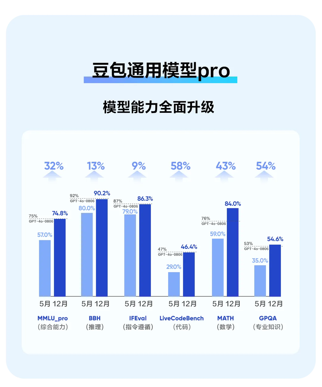 使用量和应用场景的提升,也让豆包大模型迎来了全新的升级。其中在“大语言模型评测能力榜单”的主观评测中排名第一的豆包通用模型pro完成新版本迭代,综合处理能力较5月发布时提升了32%,在推理上提升13%,在指令遵循上提升9%,在代码上提升58%,在数学上提升43%,在专业知识领域能力提升54%。