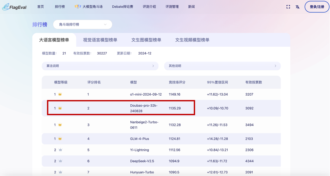 “FlagEval大模型角斗场榜单”中,豆包通用模型pro(Doubao-pro-32k-240828)。