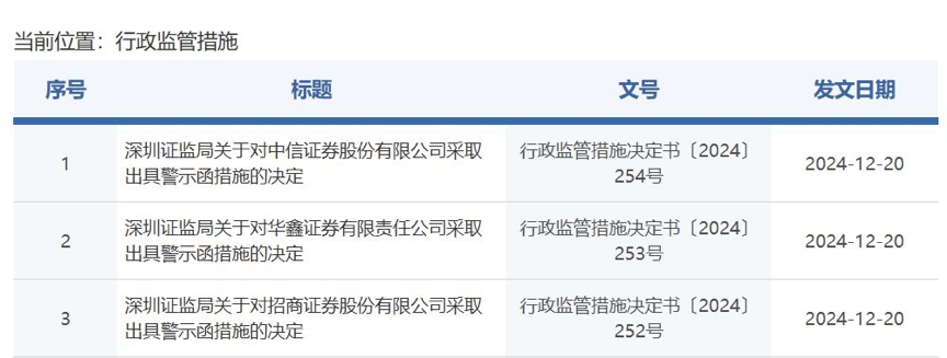 12月20日,深圳证监局网站披露三项监管措施公告,对中信证券(6000030.SH)、招商证券(6000999.SH)、华鑫证券(华鑫股份子公司600621.SH)采取出具警示函的行政监管措施。