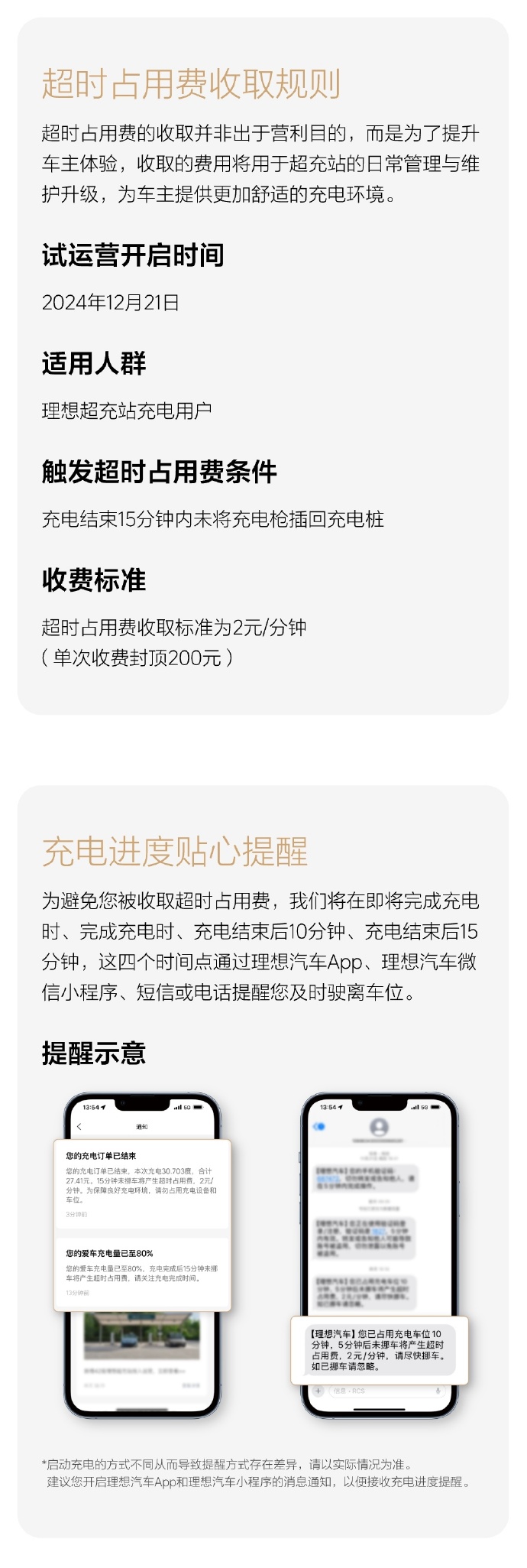 12月21日,理想汽车宣布,理想超充站超时占用费试运营正式开启,收取标准为2元/分钟,单次收费封顶200元。理想汽车称,试运营阶段会采取统一的收费标准,之后会根据实际运营情况及用户反馈进行持续迭代。