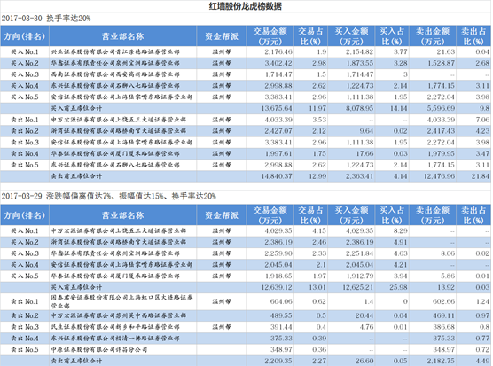 其次,“帮派系”资金是股价逆势的主要驱动,以红墙股份为例,该股近两个交易日涨幅12%,振幅高达25%,连续两天换手率超过30%,成交量放大。从龙虎榜的数据可以看到,该股在3月29日的买一和买二分别是申万宏源证券上饶五三大道营业部和浙商证券路桥南官大道营业部,熟悉游资派系的投资者很快就知道这是温州帮的席位,再结合30日的龙虎榜数据,不难发现温州帮在里面不停做T对倒。与此类似的个股还有爱司凯,洪汇新材(002802.SZ),海兴电力(603556.SH)等。